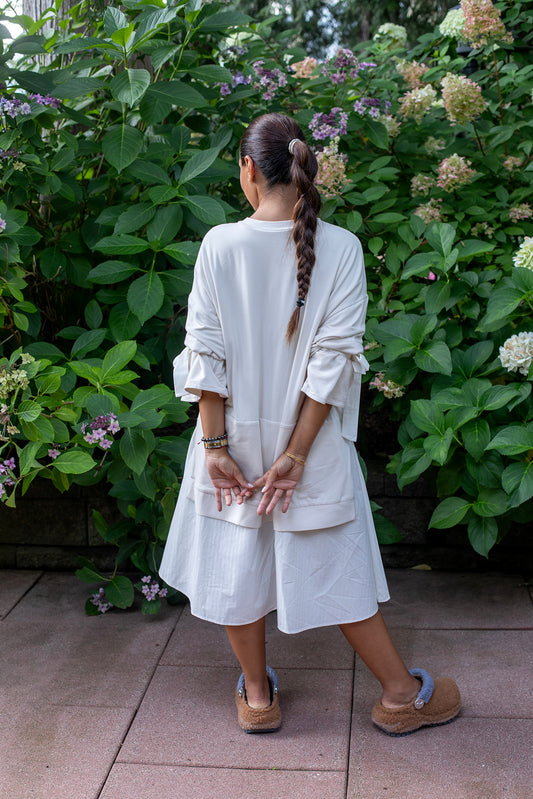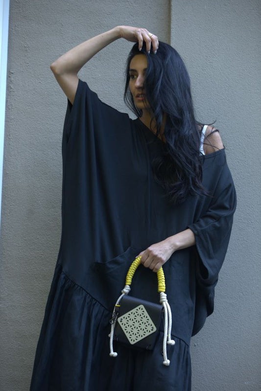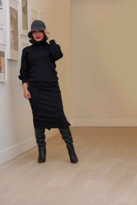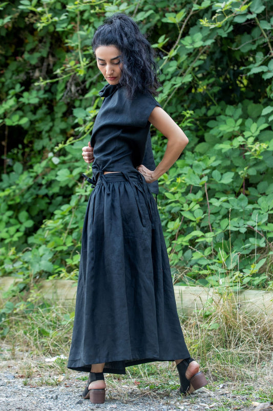 Two-Piece Linen A-Line Skirt and Top Set with Pockets, Black