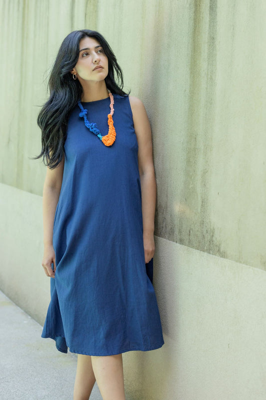 Sleeveless Dress with Bow-Tie Back Detail, Blue/Beige